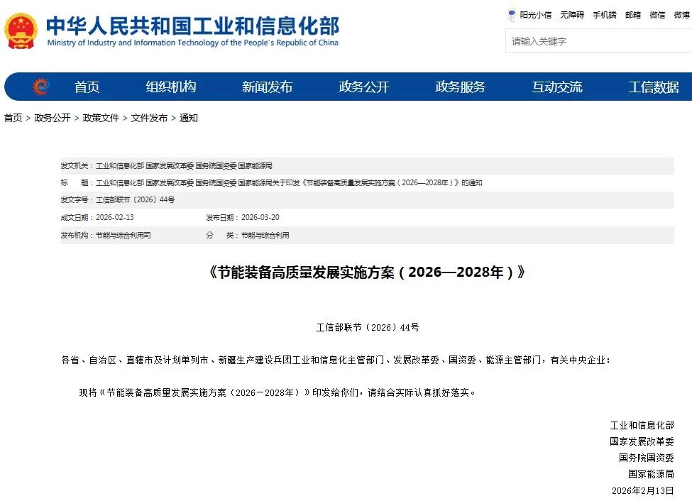 3月20日,工信部、国家发改委、国务院国资委、国家能源局等四部门联合发布《节能装备高质量发展实施方案(2026—2028年)》(以下简称《实施方案》)。《实施方案》针对更高效率、更高性能的节能电机、变压器、工业热泵、工业制冷(热)和加热设备、水电解制氢装备、信息通信设备,提出符合市场需求且节能效果突出的新材料、新部件、...
